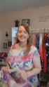 Rainbow chunky camo lightweight, off the shoulder short sleeved top with knotted bottom. 63% polyester, 33% rayon, 4% spandex.